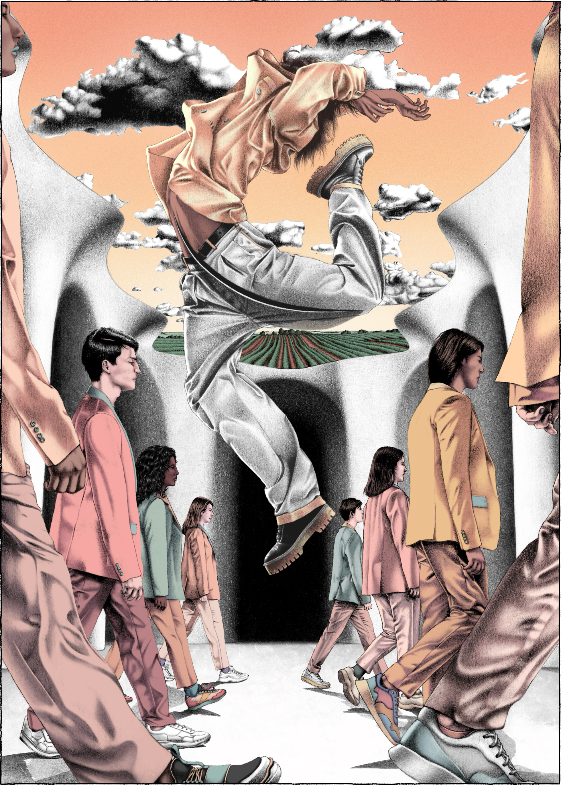 Maciej Zatorski invited me to create an illustration for Displate’s marketplace with complete creative freedom, so I decided to work on it during three art residencies: R.A.R.O. Buenos Aires (Argentina), R.A.R.O. Barcelona (Spain), and Phoenix Gallery Athens (Greece). That entire journey marked one of the most profound spiritual transformations of my life. I found myself desperately lonely, and I began engaging with others in a totally different way. In the process, dance became a vital lifeline for the emotional pain of this transformation. I even danced on the streets, knowing no one knew me, and physically felt the judgment of strangers for simply doing something that felt good and was healthy for me, merely for being different from those walking by. Following this process, I worked the conceptualization of this illustration in this way: